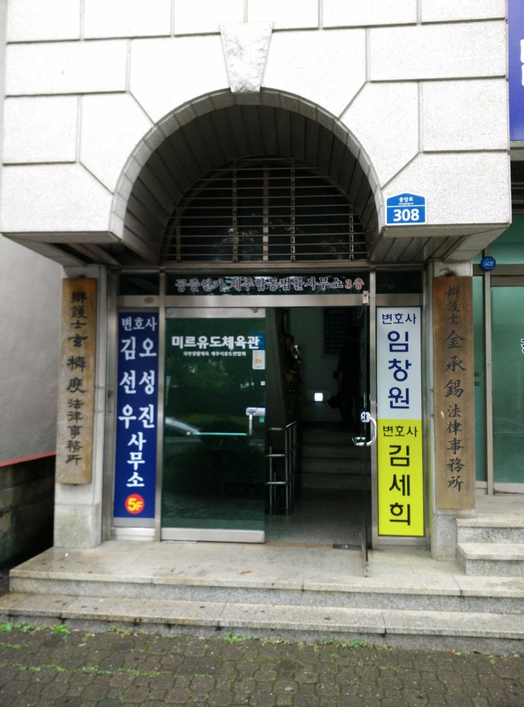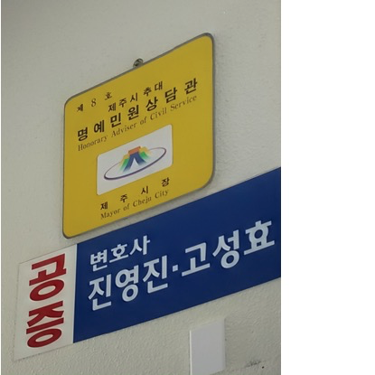 我理解的是,这种法律事务所在韩国主要从事一些非诉业务,门面不大,收费合理,而且便民。事务所门牌上有济州市长颁发的“民事法律服务名誉顾问”证书(下图)