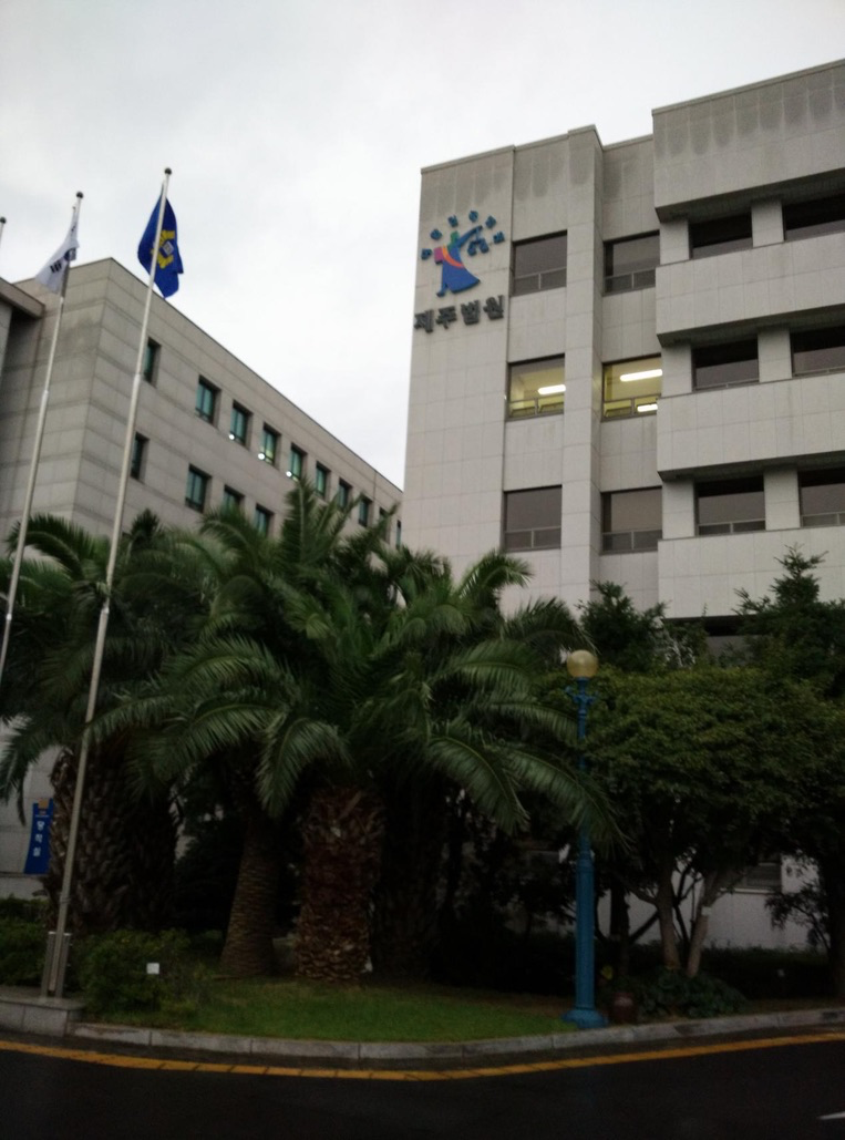 法院审判楼的外墙上有济州法院的标识(下图),一个蓝衣人左手持“公正之天平”,右手持法典。左侧的蓝色旗帜上,印着韩国宪法法院的徽章,中间一个汉字“憲”(宪的繁体字)