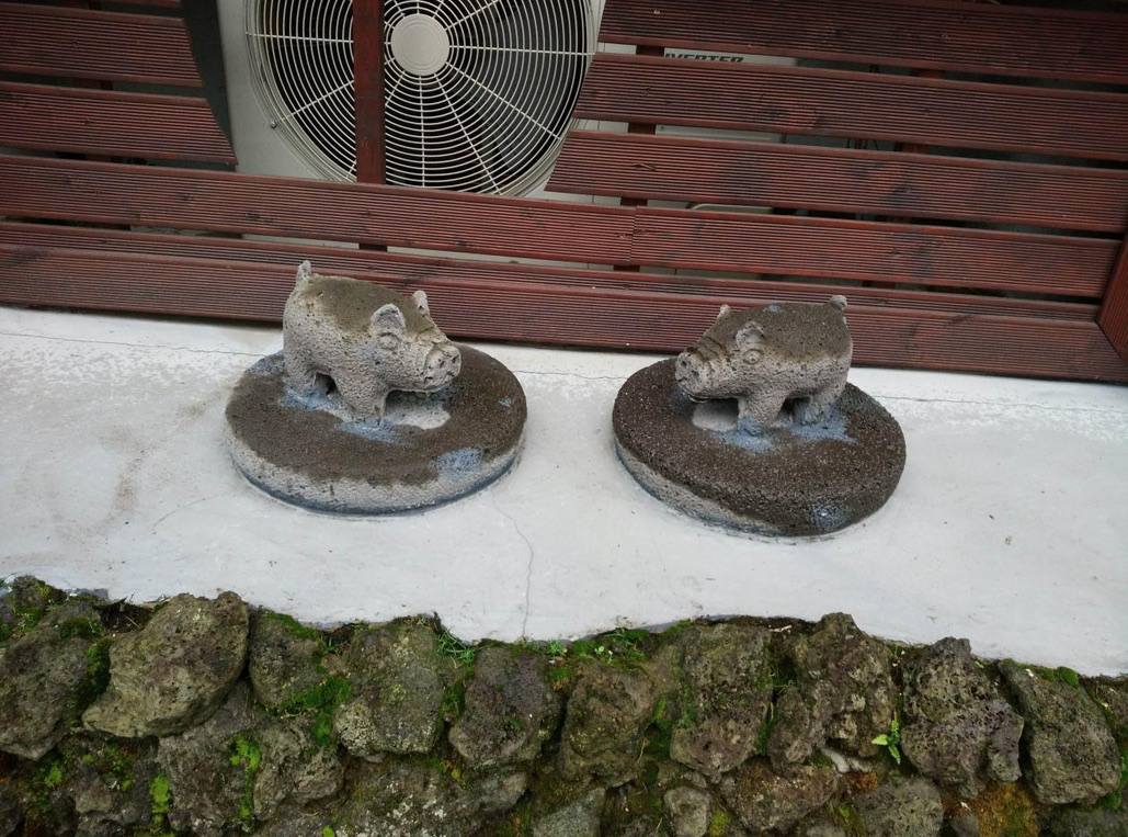窗台上一对用当地火山岩制作的小猪玩偶(下图)