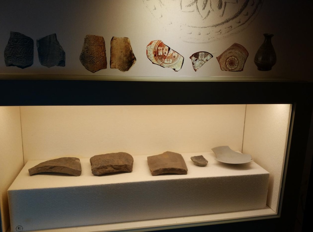 遗址发掘时找到的瓦当和碎瓷片(下图)