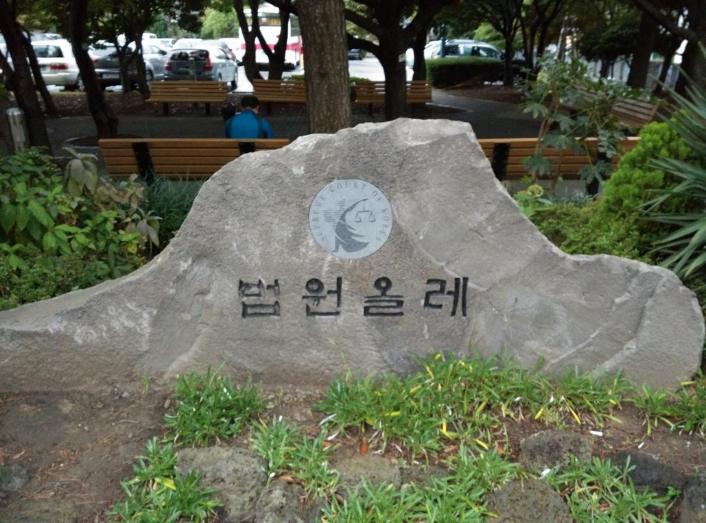 等待的时间,在院子的花园里发现了这样一块石头(下图),石头上圆图的人形和济州法院的标识一致,周围镌刻着一行英文“supreme court of korea”(韩国最高法院),下面的四个韩文“법원올레”译为“偶来路法院”,翻译解释“올레”是济州方言Olle(偶来路),意思是“家门前的小路”,好似乡间农家门囗那开满了爬藤植物和小花的羊肠小道。这么庄严而又神圣的地方居然命名的这么随意,真是让我脑洞大开。